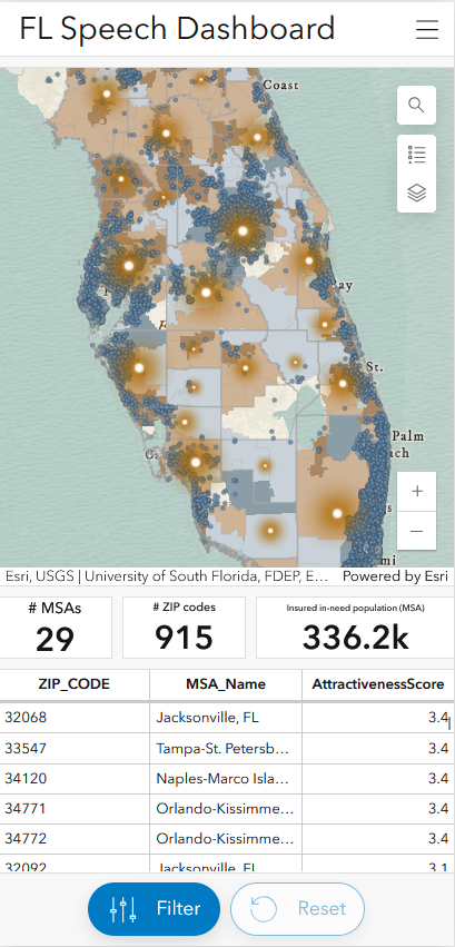 Sukūriau interaktyvų žemėlapį - švieslentę, kuris padeda vizualizuoti ir analizuoti duomenis apie kalbos sutrikimus ir kalbos terapijos paslaugų poreikį Floridos valstijoje. Šis žemėlapis leidžia filtruoti duomenis pagal įvairius kriterijus, tokius kaip amžius, lytis ir geografinė vieta, ir pateikia juos interaktyvių žemėlapių ir diagramų pavidalu. Tai padeda geriau suprasti paslaugų pasiskirstymą ir poreikį skirtingose Floridos vietovėse. Švieslentė sukurta ArcGIS online platformoje, integruoja kelis interaktyvius filtrus, dinaminius žemėlapius ir duomenų lenteles. Švieslentė dirba tiek darbalaukio, tiek mobiliojo vaizdo režimuose.