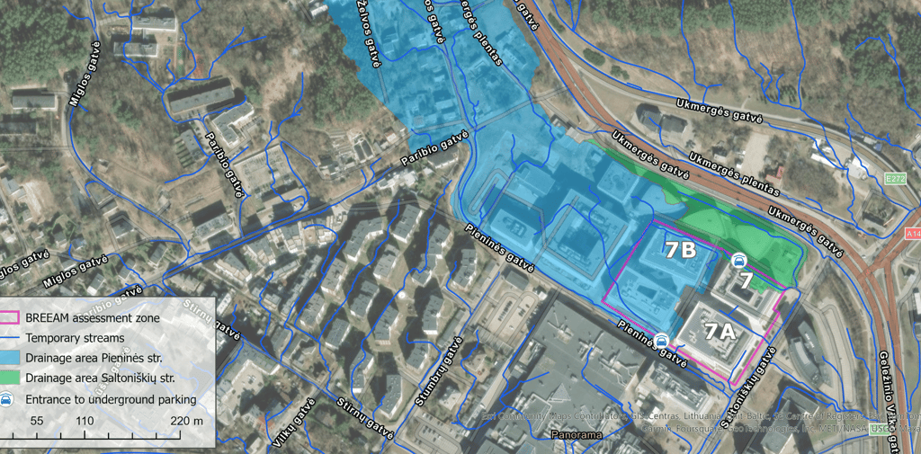 In this project, I conducted a flood risk assessment for an administrative building complex located at Saltoniškių St. 7, 7A, and 7B in Vilnius. Using GIS technology and spatial analysis tools, I created a map visualization that clearly highlights areas sensitive to flood risks.